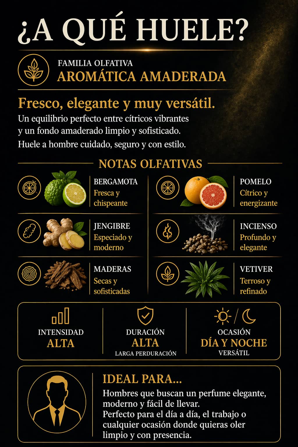 Inspirado en Bleu, este perfume une notas cítricas, amaderadas y aromáticas en una fragancia masculina, versátil y actual.
